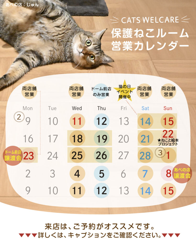 保護ねこルーム 2月の営業カレンダー・イベントのお知らせ